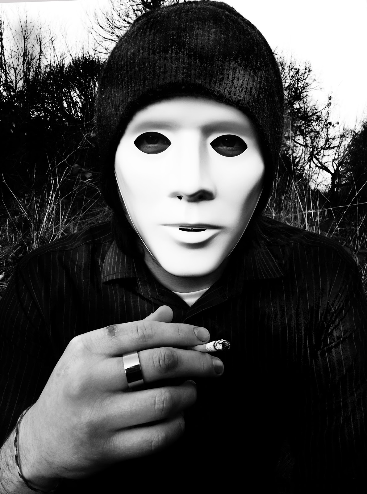 This photograph gives a slightly look to his appearance but still keeps it hidden, his thoughtful expression links with the starting point and shows his inner emotions. The shadow and detail on the hand was created on photoshop by burning the skin lines to darken them, so was the depth of the shadowing on the mask and hat, I like the tones of grey and black in this because of how dark and light they go, it almost looks slightly solarised.